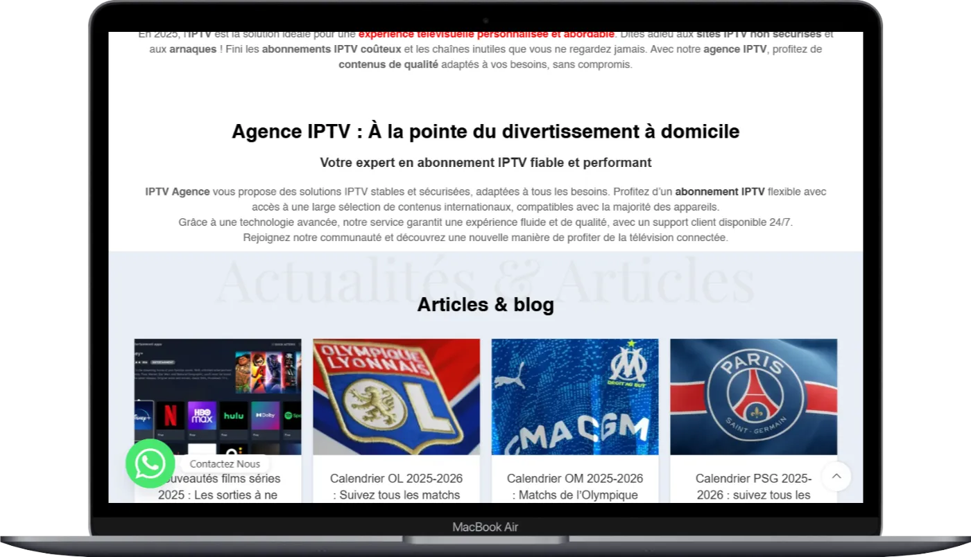 Au cours de la dernière année, j’ai également collaboré avec une agence IPTV en France pour concevoir une série de sites web de vente d’abonnements IPTV et assurer leur référencement naturel (SEO).